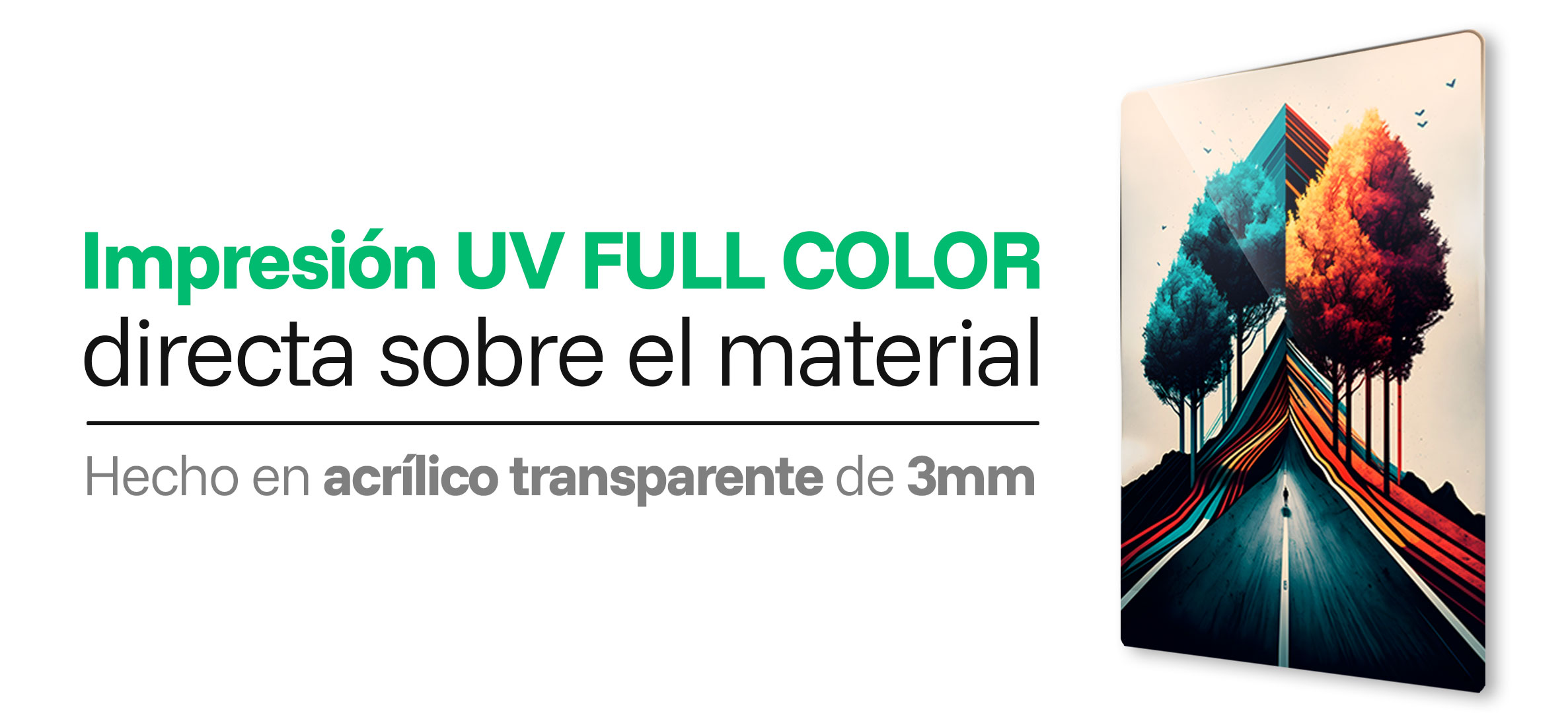 Es una tecnología de última generación que imprime directamente sobre el acrílico y fija la tinta mediante luz UV, logrando máxima precisión y durabilidad.