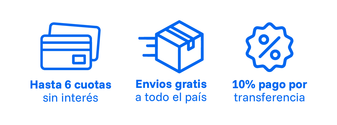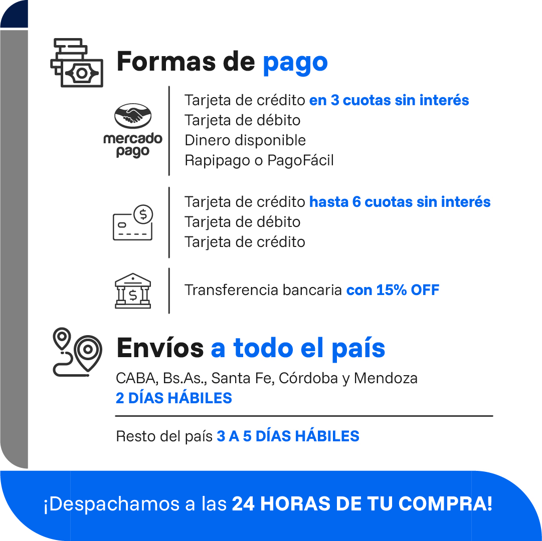 Aceptamos tarjetas de crédito hasta 6 cuotas sin interés, débito y transferencias bancarias con un 10% de descuento. ¡Aceptamos todas las tarjetas!